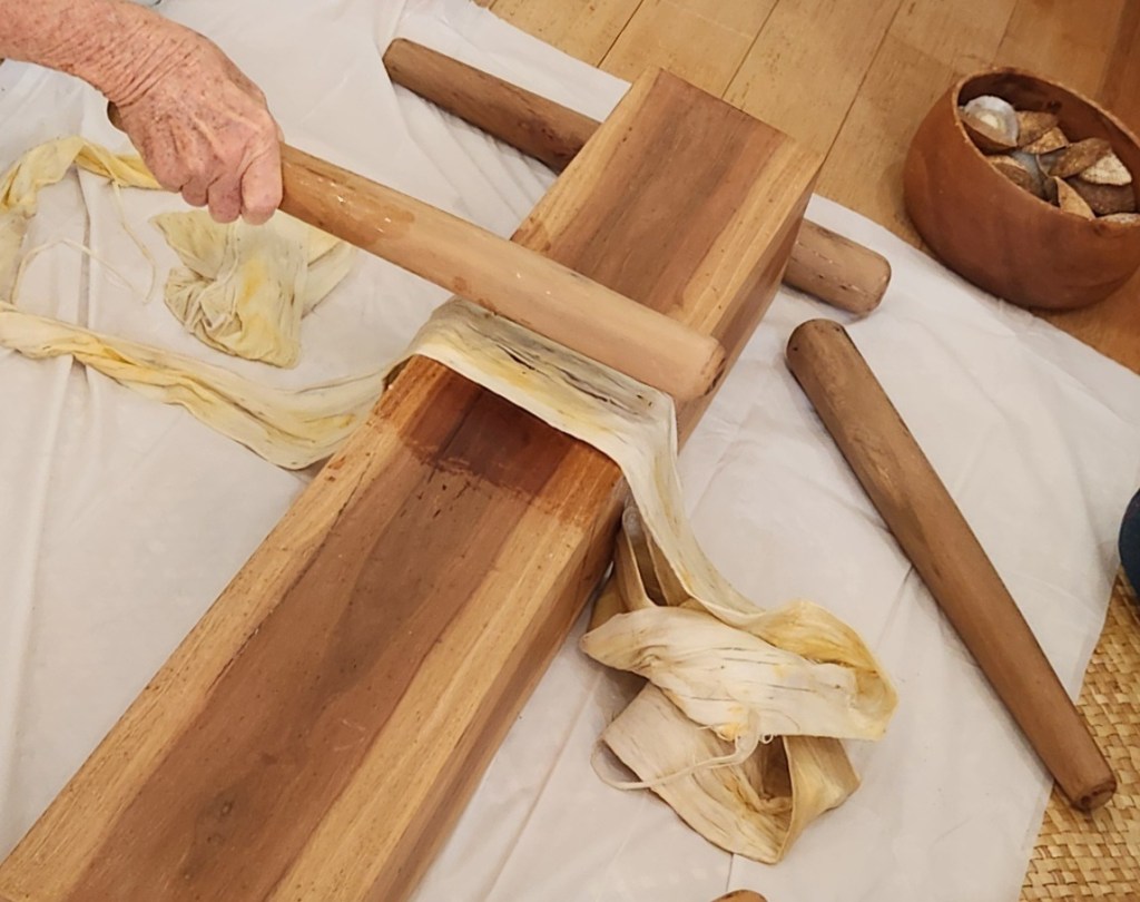 In Aotearoa, aute is the name given to the paper mulberry tree and the beaten cloth. What evidence do we have to tell the story about aute from Aotearoa? Well, historians and archaeologists have been able to piece together some important facts from the very little material remains of aute by the Maori people. Firstly, aute is mentioned in Maori oral histories. In particular, the kite of the demi-god Maui. It is believed that the paper mulberry tree was brought on the canoes of Polynesian ancestors and was cultivated on aute plantations up until the 1840’s. According to historical documents, Captain Cook was shown a highly valued plantation of aute trees in 1769. The impact of European contact and cattle farming are causes that led to the final extinction of Maori aute plantations. However, evidence indeed proves that aute was used for wrapping religious god images and protecting valuables; as seen in the finished pieces found hidden in ancient dry caves. Furthermore, some worn aute beaters have been recovered in swamps and these are estimated to be several hundred years old. Apart from this evidence, not much of material remnant has been found of the aute of Aotearoa.