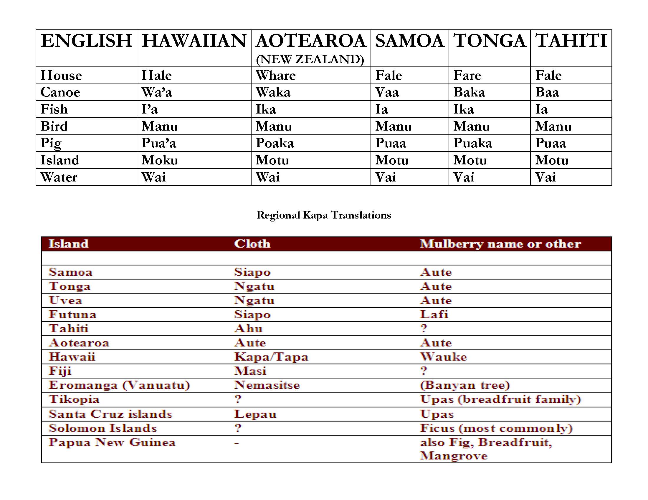 Linguistic origin of the Hawaiian language can be traced through genealogy chants, indicating family ties to the South Pacific islands of Polynesia and beyond. Words have similarities in sound and meaning. For example, one general rule is that in South Pacific Polynesia, the /r/ and /t/ sounds substitute for /l/ and /k/, as in the words kapa, kalo, and moku of Hawai’i and tapa, taro, and motu of Tahiti. An exception to this rule is found in Ni’ihau, where a soft /t/ sound is predominantly used in place of the /k/. The /k/ used in song, prayer and other specific occasions.