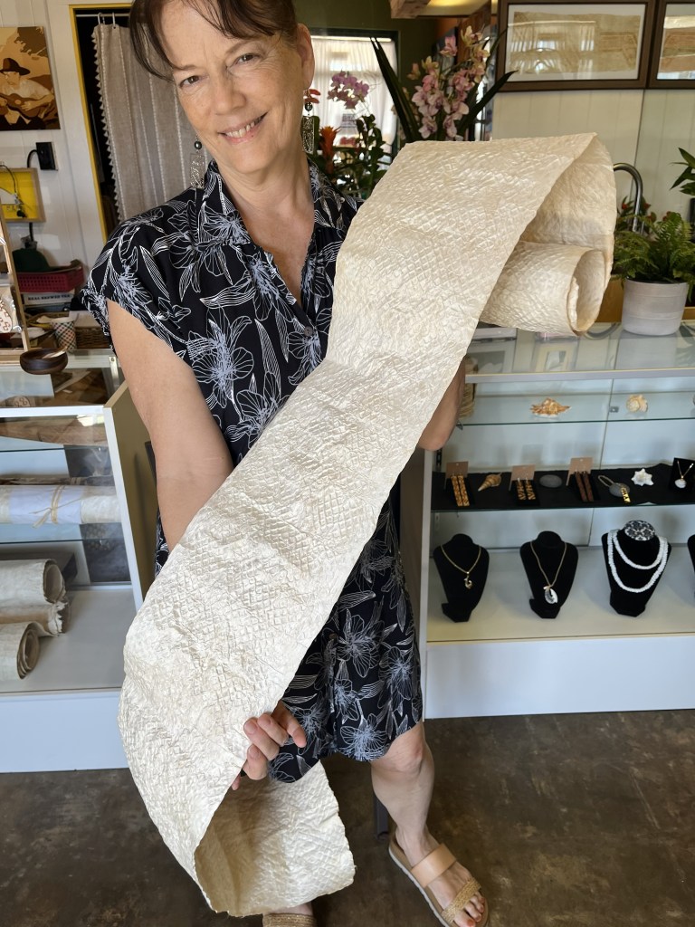 In Aotearoa, aute is the name given to the paper mulberry tree and the beaten cloth. What evidence do we have to tell the story about aute from Aotearoa? Well, historians and archaeologists have been able to piece together some important facts from the very little material remains of aute by the Maori people. Firstly, aute is mentioned in Maori oral histories. In particular, the kite of the demi-god Maui. It is believed that the paper mulberry tree was brought on the canoes of Polynesian ancestors and was cultivated on aute plantations up until the 1840’s. According to historical documents, Captain Cook was shown a highly valued plantation of aute trees in 1769. The impact of European contact and cattle farming are causes that led to the final extinction of Maori aute plantations. However, evidence indeed proves that aute was used for wrapping religious god images and protecting valuables; as seen in the finished pieces found hidden in ancient dry caves. Furthermore, some worn aute beaters have been recovered in swamps and these are estimated to be several hundred years old. Apart from this evidence, not much of material remnant has been found of the aute of Aotearoa.